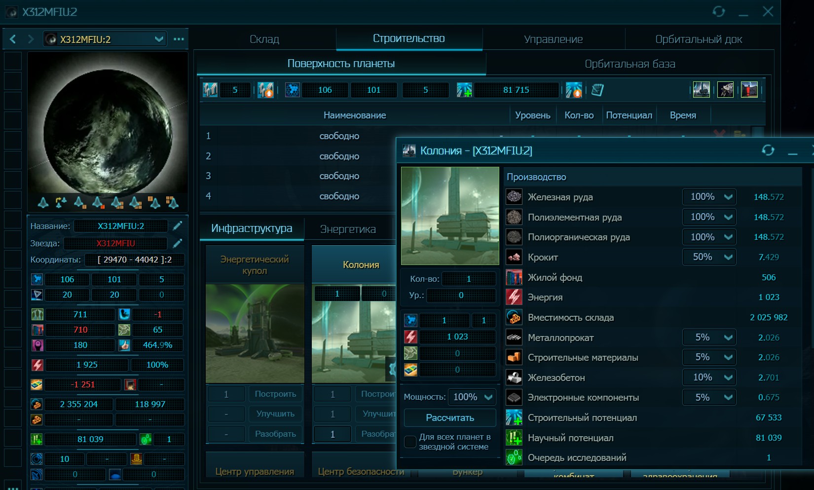 Как говорилось выше – экономика здесь весьма сложная, но тем более интересен процесс развития. Здесь нет, как в большинстве игр, 3-4 видов ресурсов. Только топлива для кораблей и электростанций используется 4 вида, а есть ещё 19 видов добываемых ресурсов, из которых производится 13 видов материалов. Большинство ресурсов добывается на планетах и астероидах, но есть уникальные, которые присутствуют исключительно на астероидах или вырабатываются только на орбитальных станциях. Для добычи на астероидах необходимо строить добывающий флот, а для этого необходимы соответствующие исследования, орбитальная станция с командным центром, доком и ангаром. Кстати, ваша первая планета абсолютно неприкосновенная, так же как и её орбитальная станция и все расположенные на её орбите флота. Отличный способ сохранить корабли без необходимости постоянных перелётов.